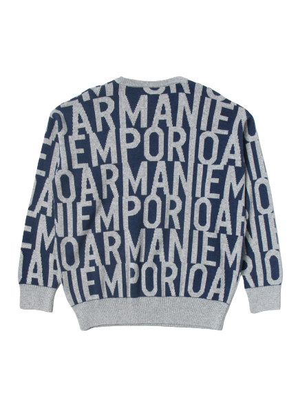 Emporio Armani Kids. Blu navy, grigio ghiaccio, misto cotone e cashmere, design lavorato a maglia, logo intarsiato, effetto mélange, girocollo e maniche lunghe. Origine: Italia. Viscosa 35%, Cotone 35%, Poliammide 25%, Cashmere 5%. Lavare a mano.