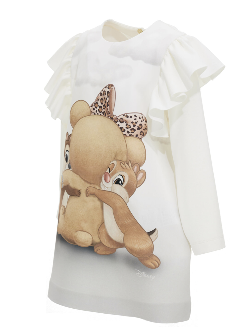 Monnalisa Kids. Abito m/l in jersey punto milano panna, stampa abbraccio personaggi CIP e CIOP sul fronte, rouches sulle spalle, zip sul retro a chiusura.