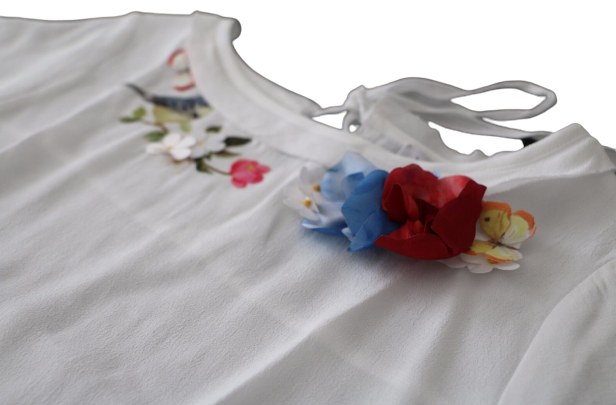 Monnalisa Kids, Blousa bambina in viscosa, fiori sul giro collo, chiusura con fiocco sul reto. Composizione: 100% Viscosa.