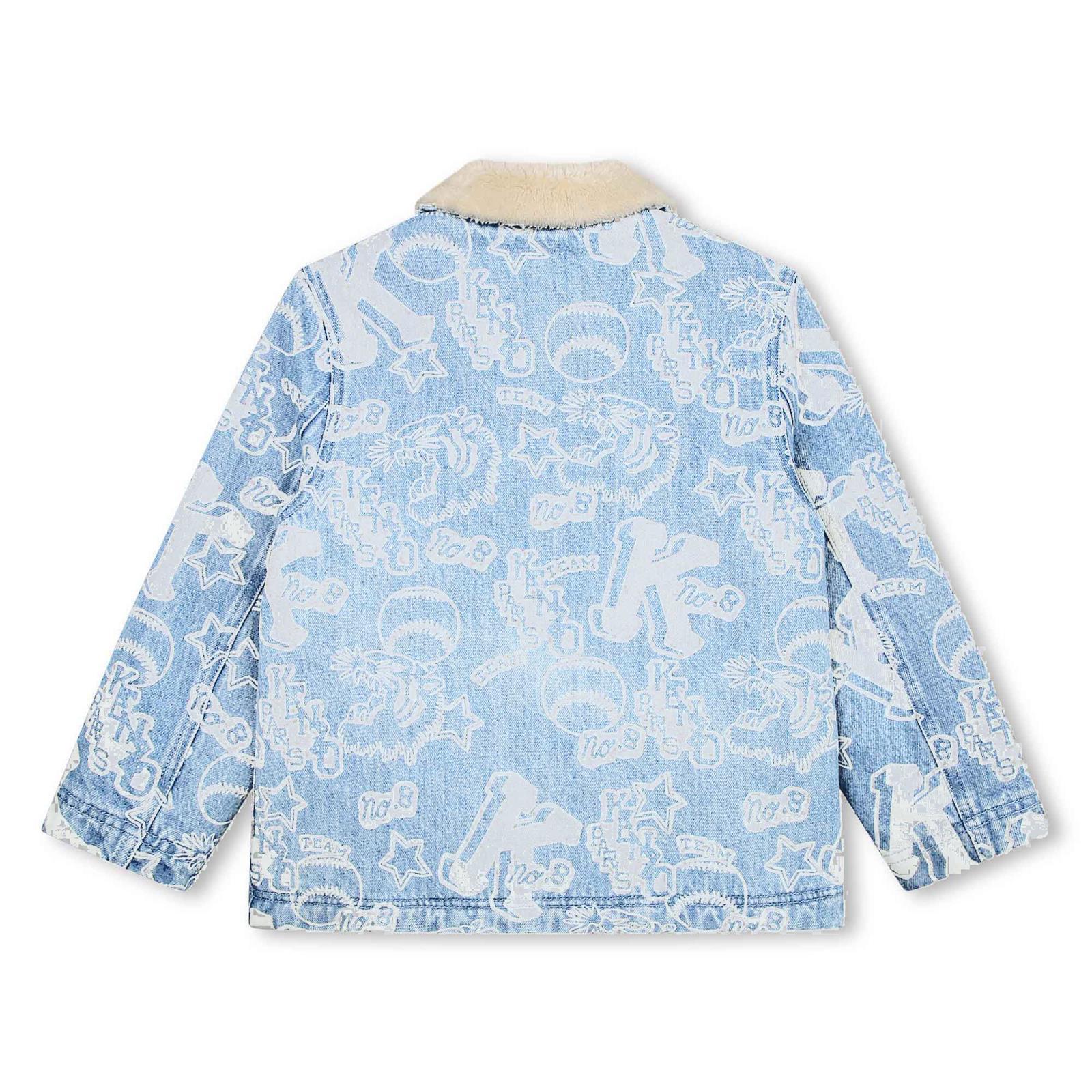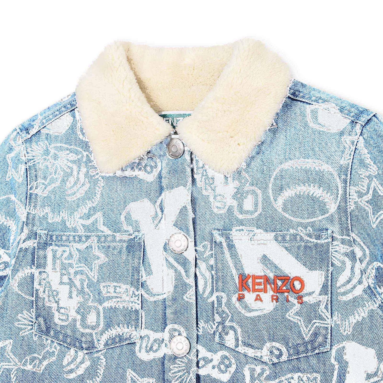 Kenzo Kids, blu chiaro, cotone, denim, stampa con logo all-over, logo ricamato sul petto, fodera in pelliccia cruelty-free, colletto in pelliccia cruelty-free, maniche lunghe, chiusura frontale con bottoni a pressione, due tasche applicate sul petto e due tasche laterali applicate. Composizione: poliestere 100%