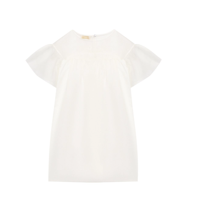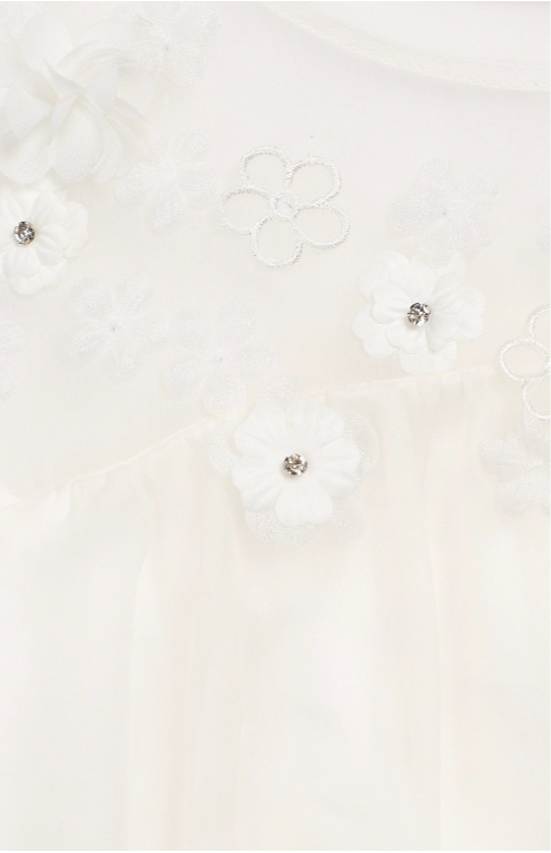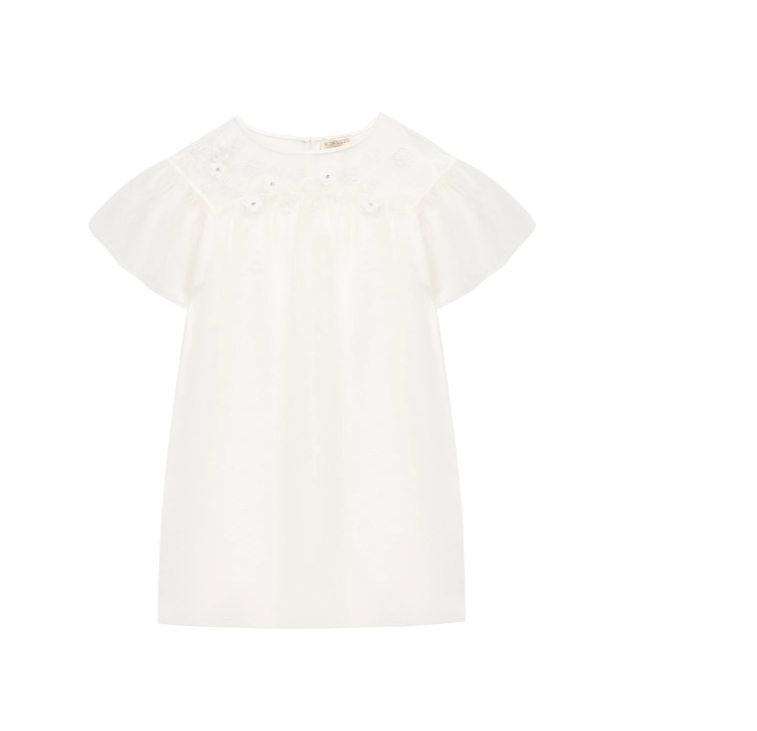 Monnalisa Kids, bianco, rosa petalo e fucsia impreziositi da ricami e stampe floreali, boccioli, tralci o maxi rose, una linea di abbigliamento elegante per bambine ispirata al garden, con abiti romantici in crêpe leggere o vaporosi tulle, con maniche scenografiche o gonne preziose. Perfetti per la cerimonia contemporanea. Composizione: 100% Seta.