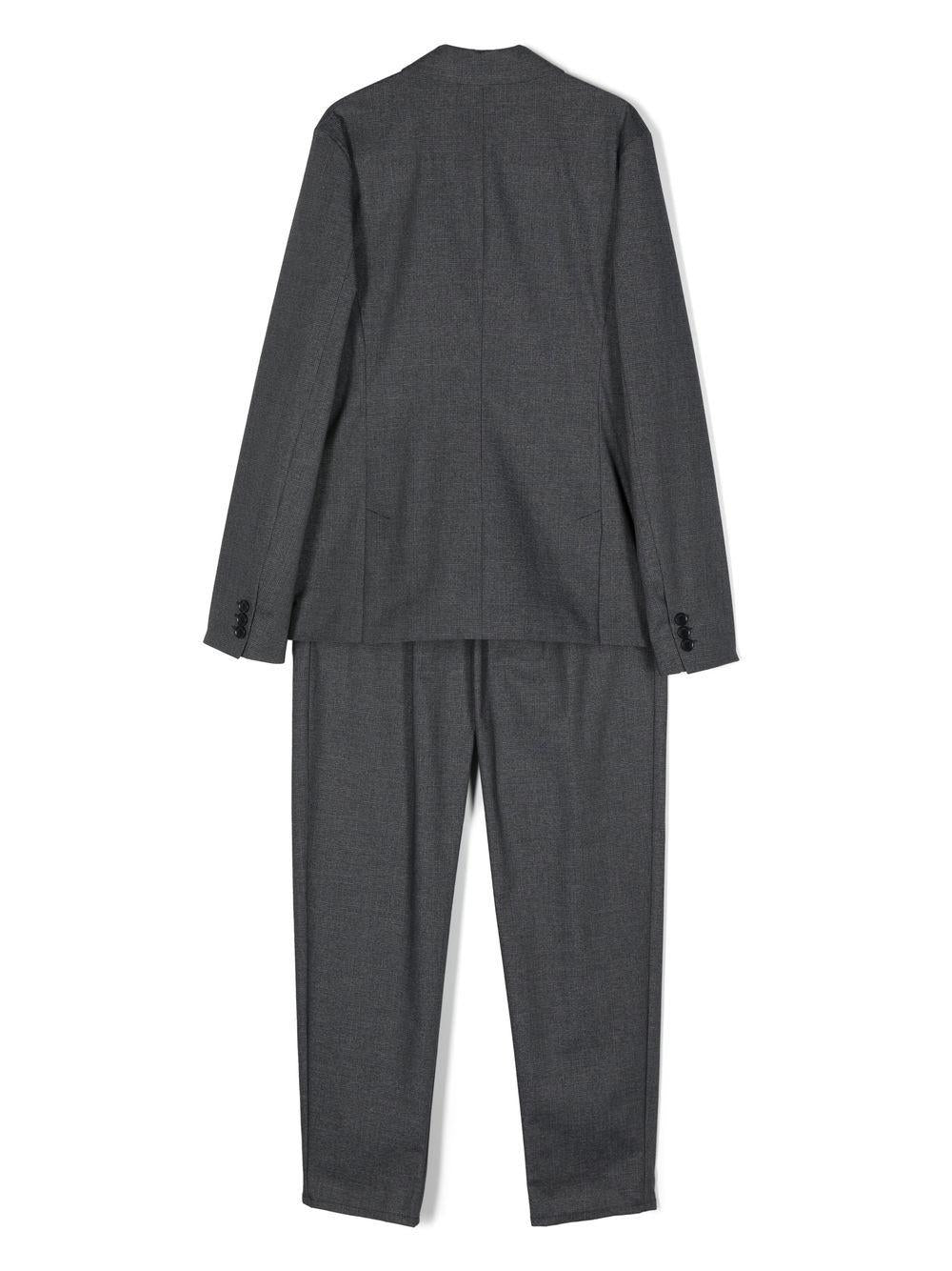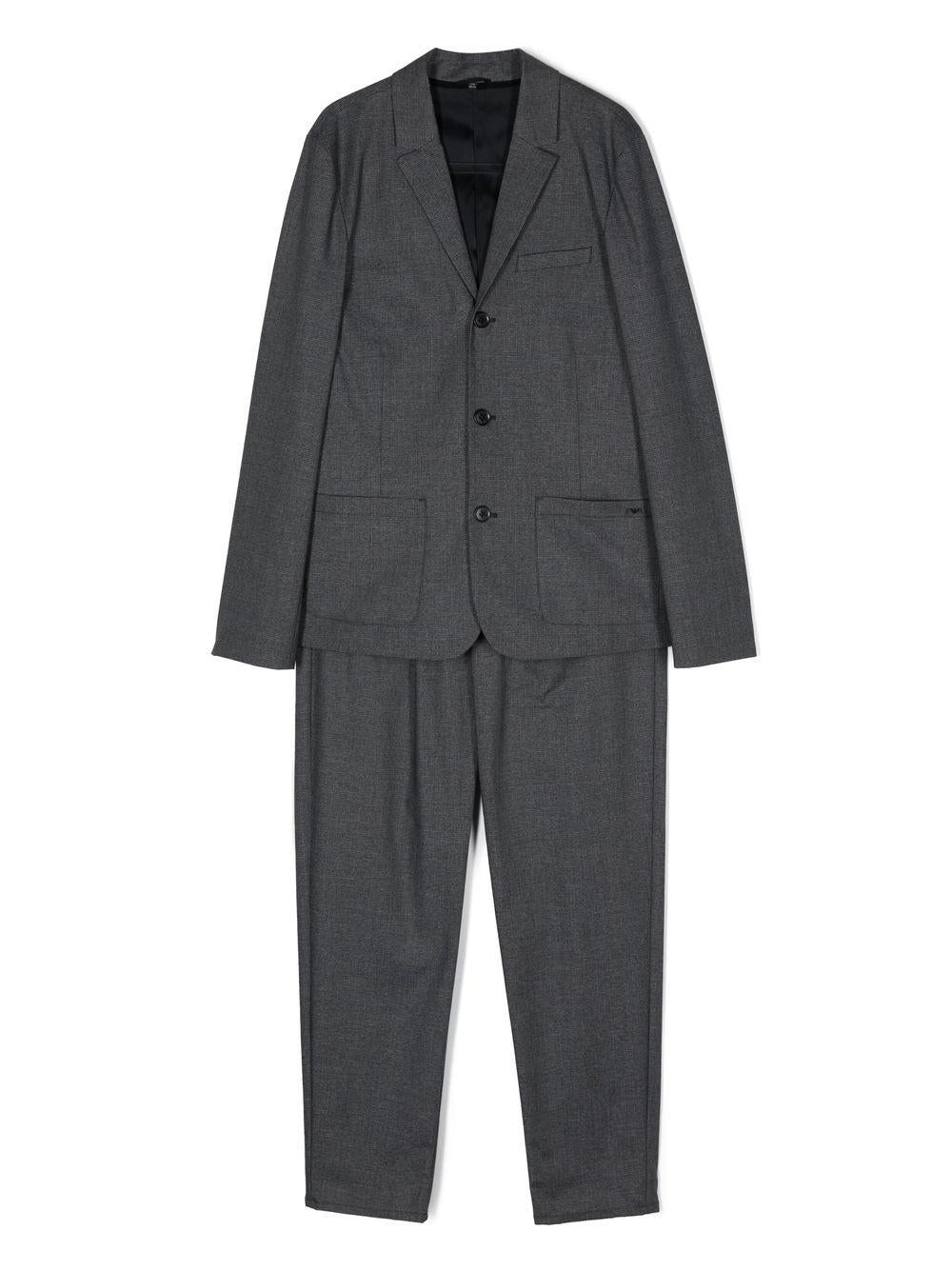 Emporio Armani Kids, grigio antracite, revers classici, chiusura frontale con bottoni, maniche lunghe, tasca a filetto sul petto, due tasche frontali con pattina, orlo dritto, vita con coulisse, due tasche laterali a filetto e gamba affusolata.