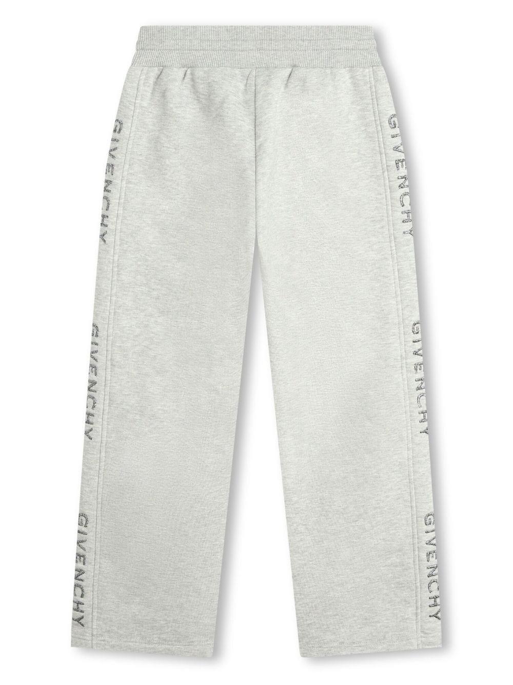 Givenchy Kids, grigio, misto cotone, dettaglio laterale a righe, stampa con logo laterale, gamba ampia, due tasche diagonali laterali e orlo dritto. Composizione: cotone 86%, poliestere 14%
