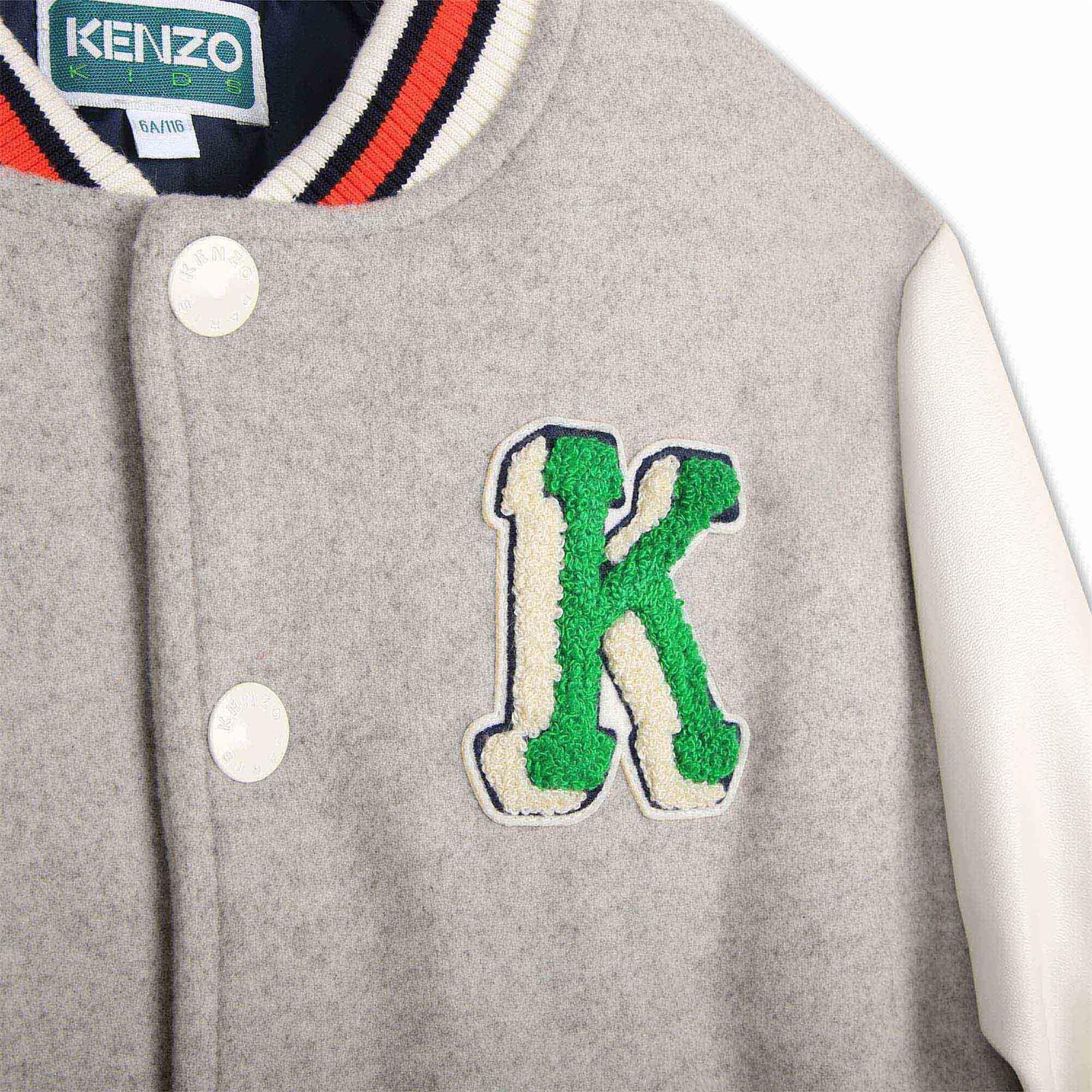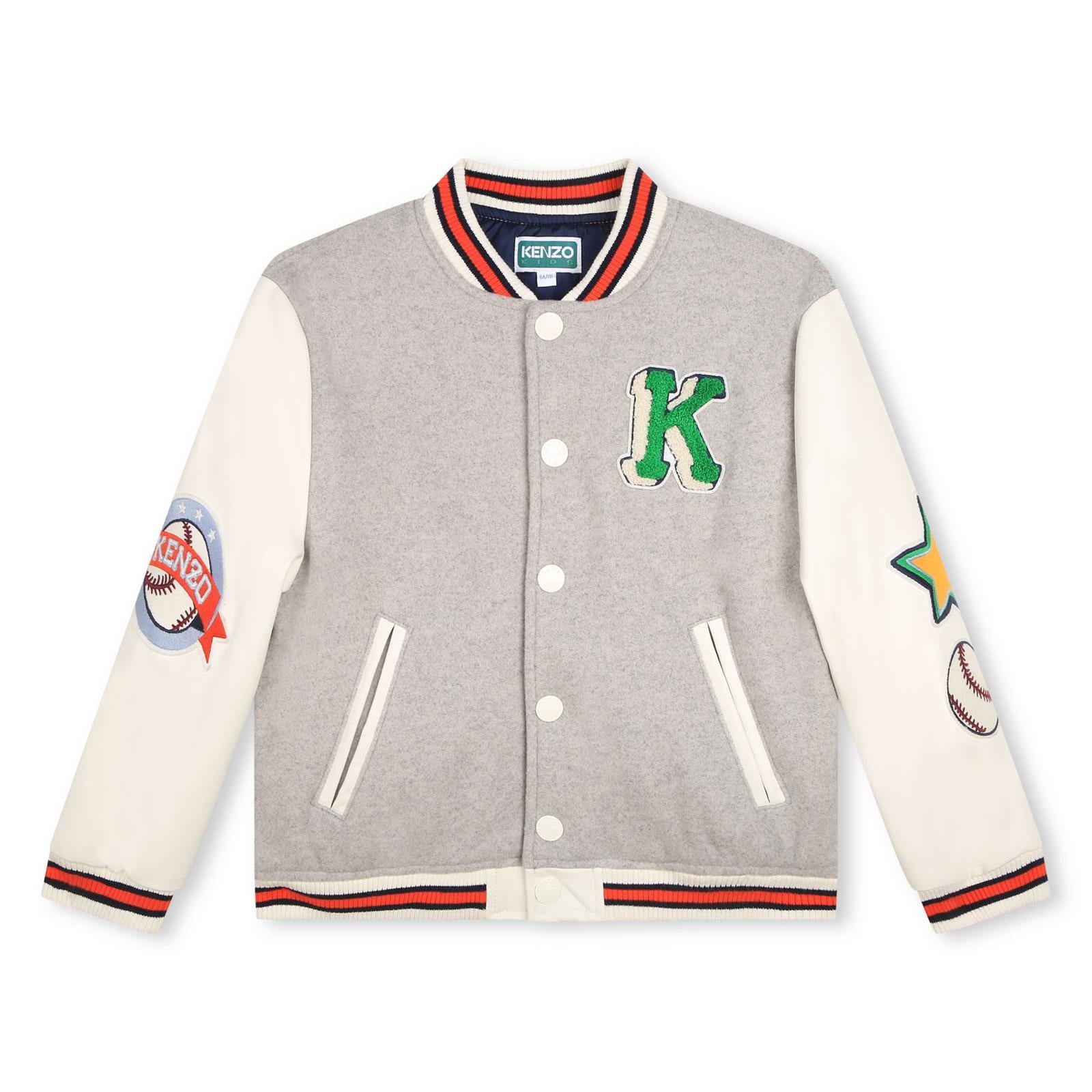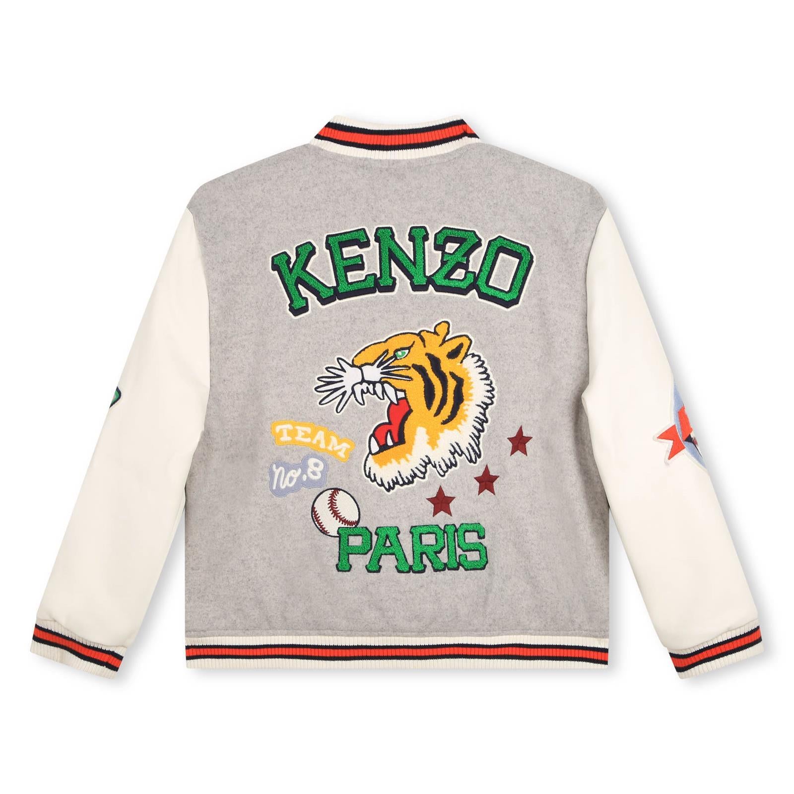 Kenzo Kids, Grigio, multicolore, logo ricamato sul petto, applicazione sulla manica con logo, applicazione posteriore con logo, dettaglio a righe, colletto a coste, chiusura frontale con bottoni a pressione, maniche lunghe e due tasche con inserti. Composizione: Esterno: poliuretano 100%, poliestere 50%, viscosa 50% ; Fodera: poliestere 100%