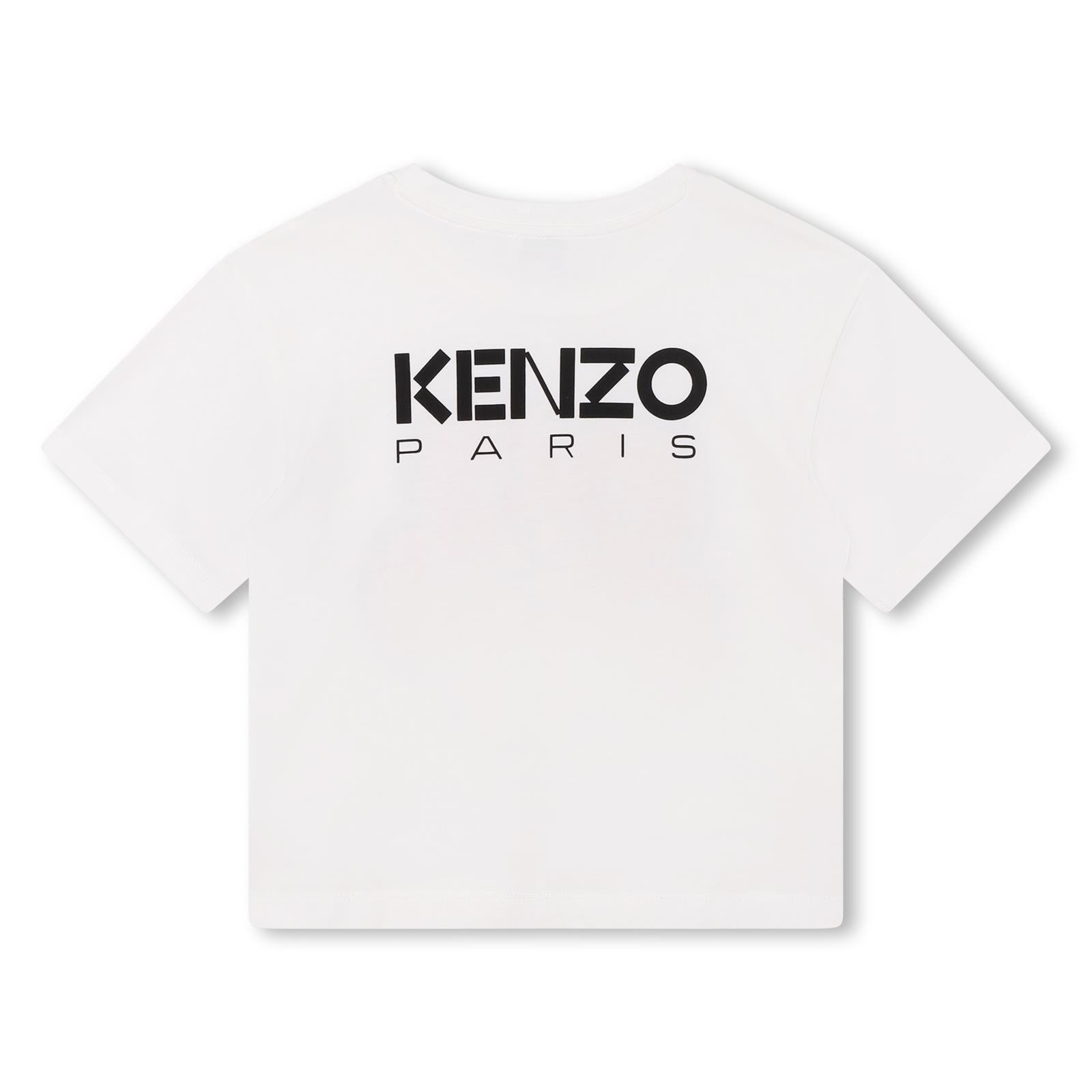 Kenzo Kids, Tonalità bianco avorio, cotone, stampa a fiori sul davanti, stampa con logo sul retro, girocollo, maniche corte e orlo dritto. Composizione: cotone 100%