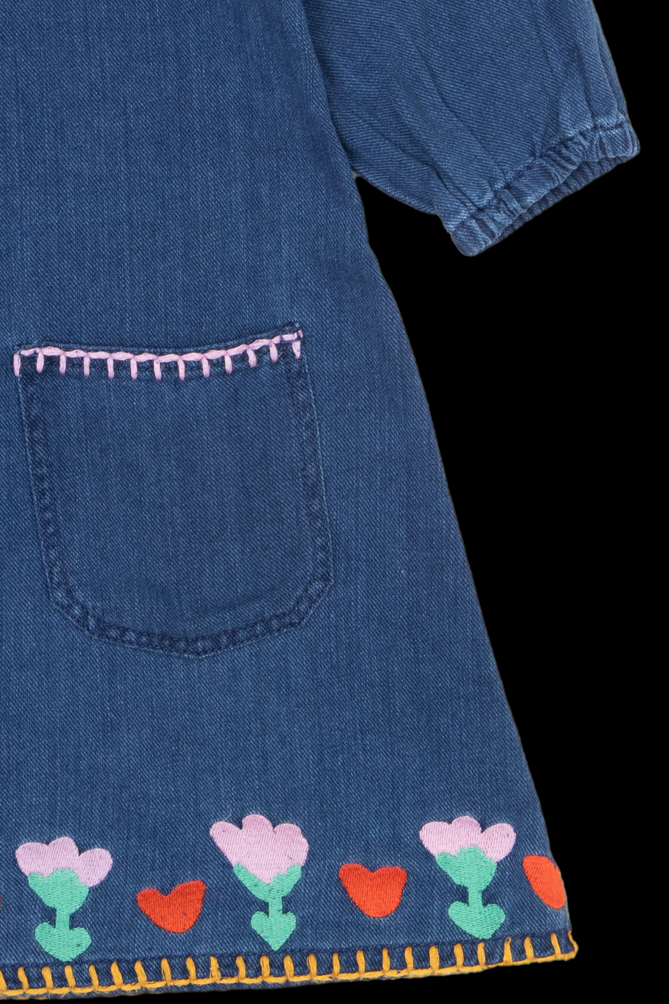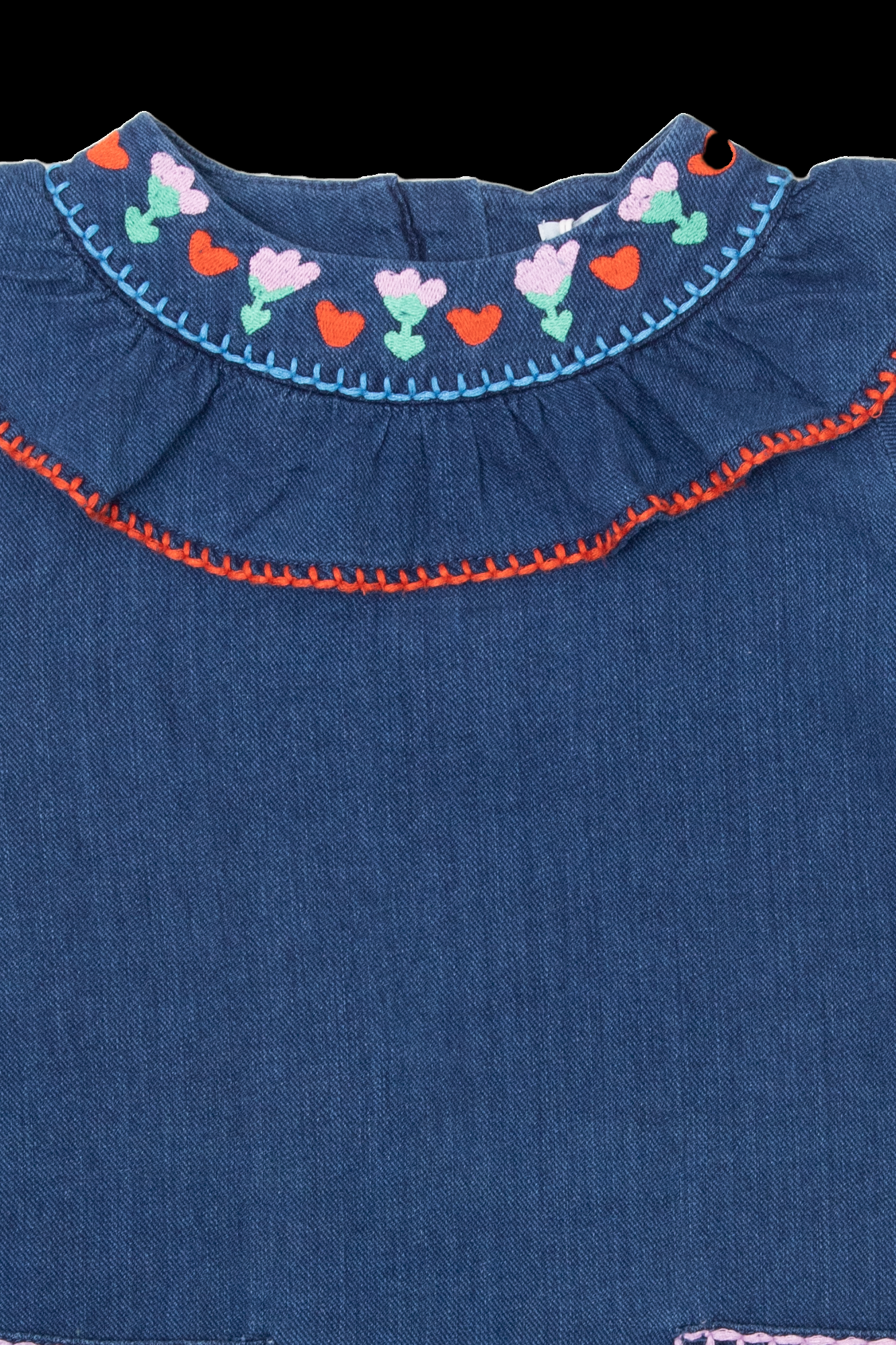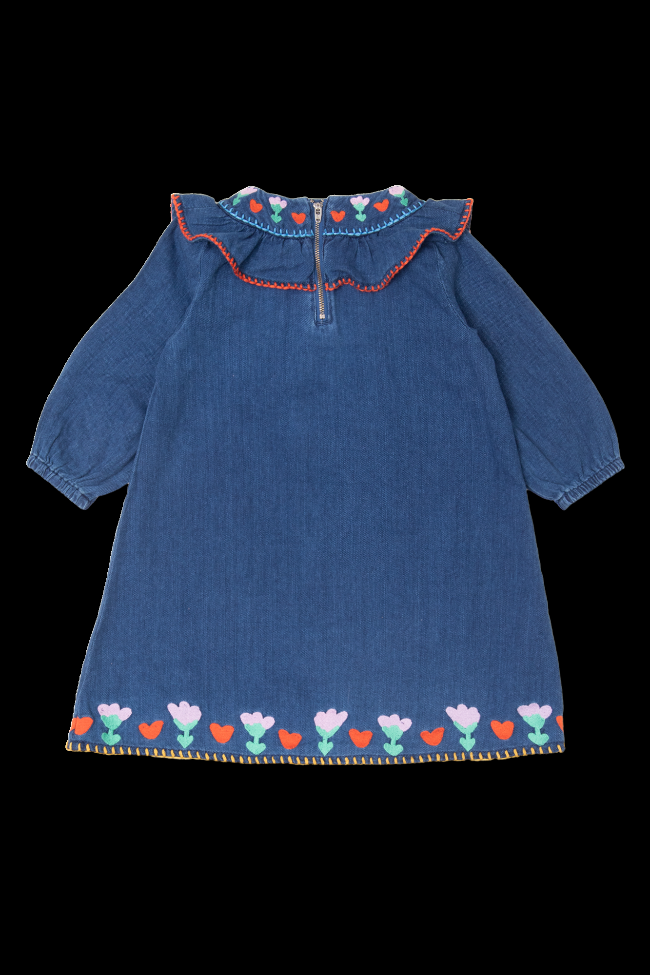 Stella McCartney Kids, indaco, multicolore, cotone, denim, ricamo a fiori, motivo con ricamo, orlo con punto festone, scollo rotondo, colletto con increspature, chiusura posteriore con zip, maniche lunghe, polsini elasticizzati, due tasche applicate frontali e orlo dritto. Composizione:cotone sostenibile 100%, poliestere 100%