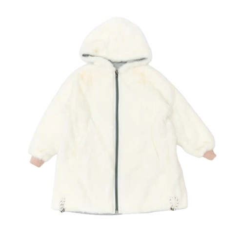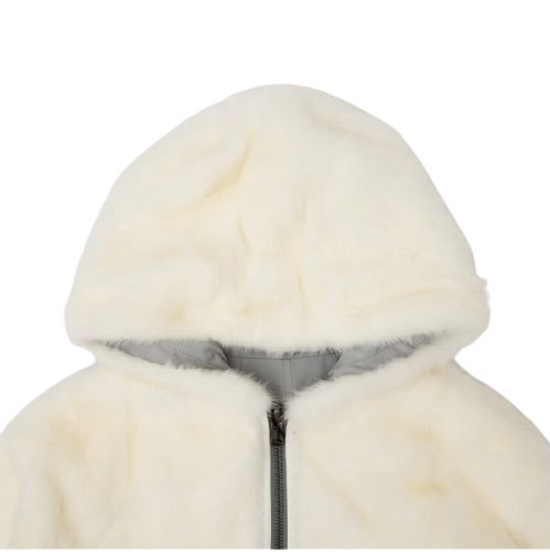 Yves Salomon, cappotto reversibile, chiusura con zip sul davanti, cappuccio, polsini elasticizzati, colore grigio chiaro. Composizione: 100% Poliestere.
