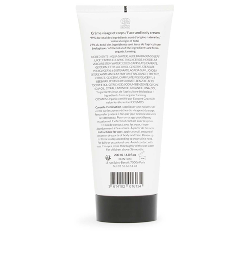 Bonton Kids. La ricca crema è certificata Cosmos Organic da Ecocert Greenlife secondo lo standard Cosmos la cui formula è composta al 99% da ingredienti naturali. Una texture cremosa e avvolgente per lenire la pelle delicata, da applicare sulle zone secche del viso e del corpo.Composto da aloe vera da Agricoltura Biologica, ingrediente riconosciuto per le sue proprietà lenitive, calmanti e rigeneranti, la sua texture fluida si assorbe rapidamente e lascia sulla pelle un velo leggero e deliziosamente profumato con note di fiori d'arancio e arancia amara. Fatto in Francia.ISTRUZIONI PER L'USO: Applicare una piccola quantità di crema sulle zone asciutte del viso e del corpo. Da utilizzare non appena la pelle si sente un po' troppo tesa e chiede aiuto. Rinnova fino a 3 volte al giorno in base alle esigenze della tua pelle. Adatto dai 36 mesi.