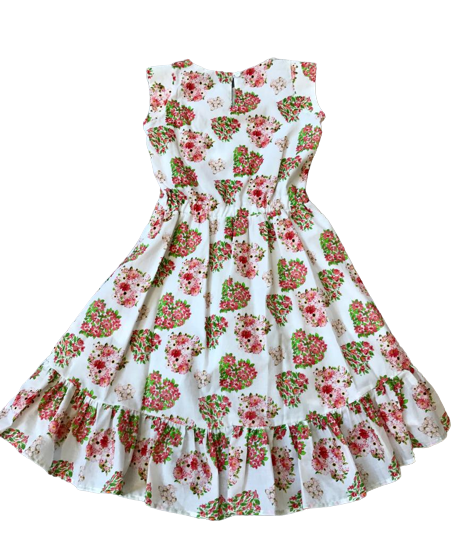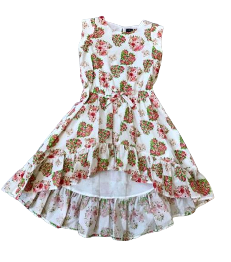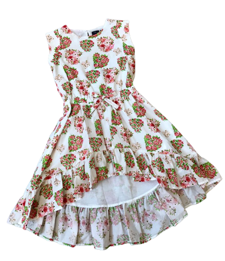 Miss Blumarine Kids, Abito stampa floreale, smanicato, cintura in vita, gonna con rousche più corta sul davanti. Cotone