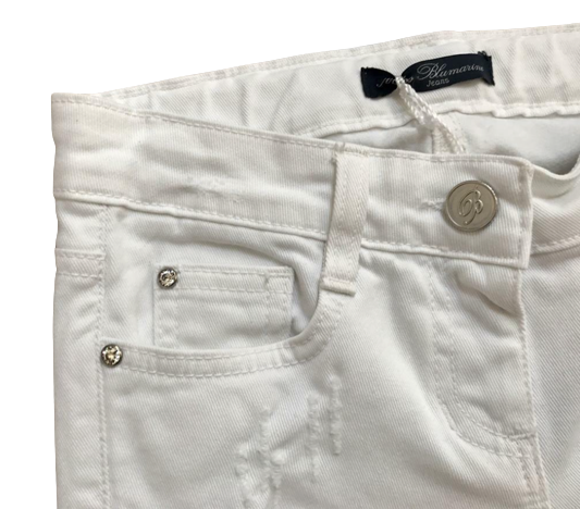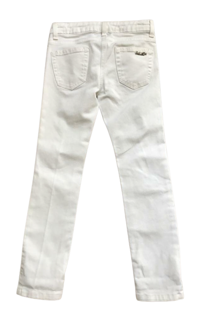 Miss Blumarine Kids, twill, logo, effetto delave, tinta unita, vita normale, regular fit, gamba dritta, zip e bottoni, multitasche, elasticizzato, lavare a 30°, non lavabile a secco, stirare a max 110°, non candeggiare, non asciugare meccanicamente, 5 tasche. 98% Cotone, 2% Elastan