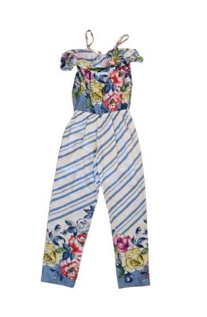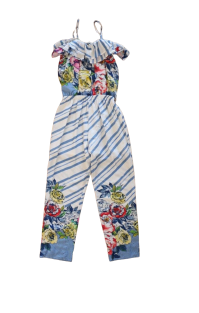 Miss Blumarine Kids, Tuta a fiore e righe, spalline regolabile, roushe, cintura in vita. Cotone
