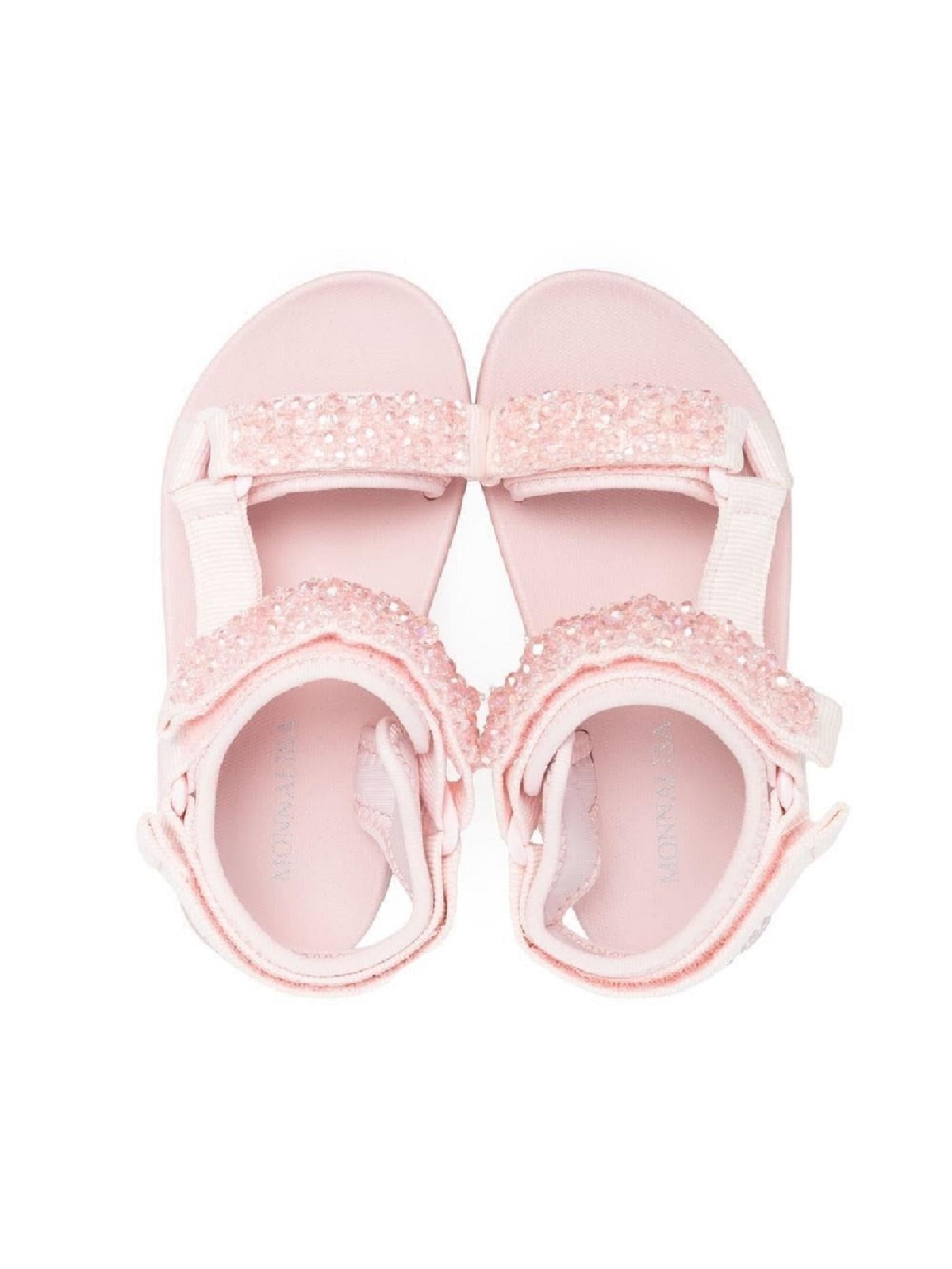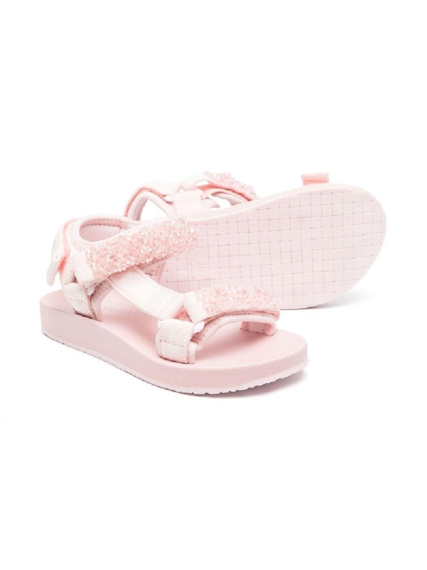 Monnalisa Kids, rosa, decorazioni con paillettes, punta aperta, chiusura frontale a strappo, chiusura a strappo alla caviglia, suola piatta.