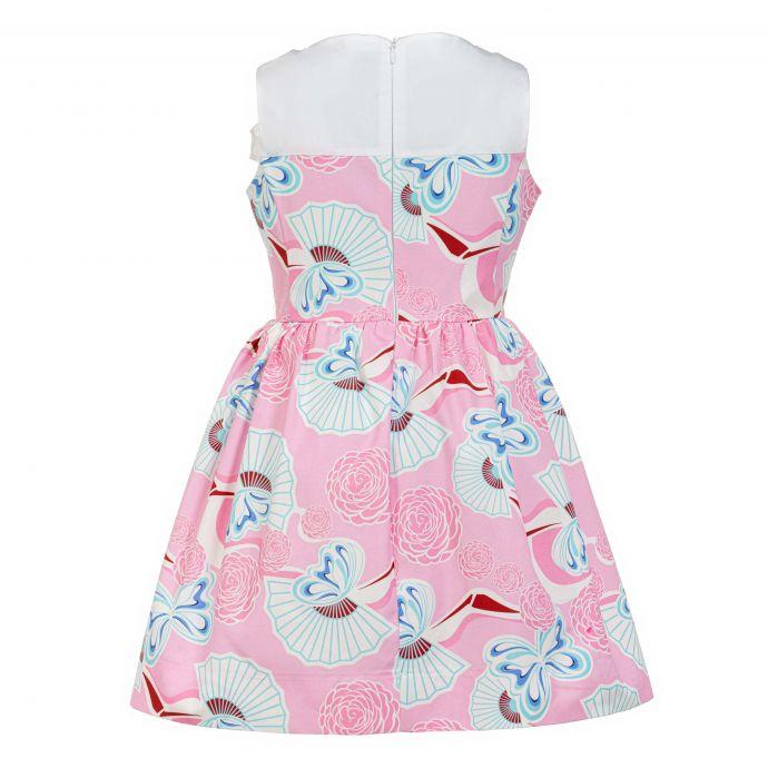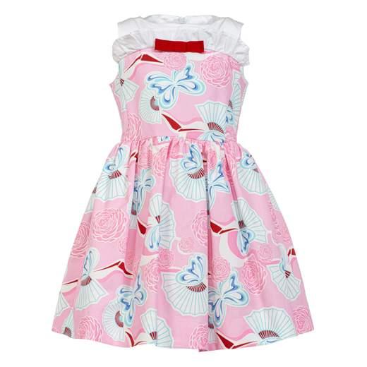 Simonetta Kids, Abito in popelaine di cotone, fantasia floreale, smanicato, rousche e fiocco sullo scollo. 100%Cotone