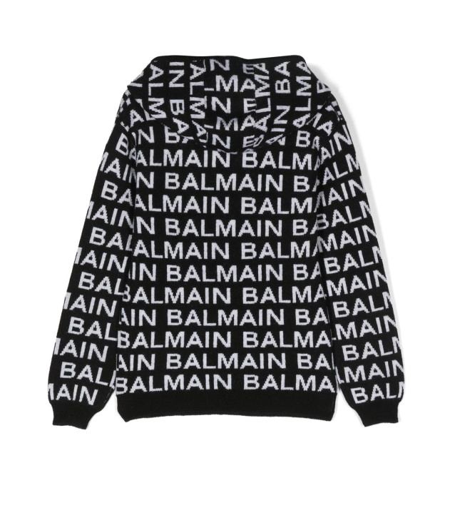 Balmain Kids. Nero/bianco, logo intarsiato, cappuccio e maniche lunghe. Lana Vergine 95%, Poliestere 5%. Lavare a mano.