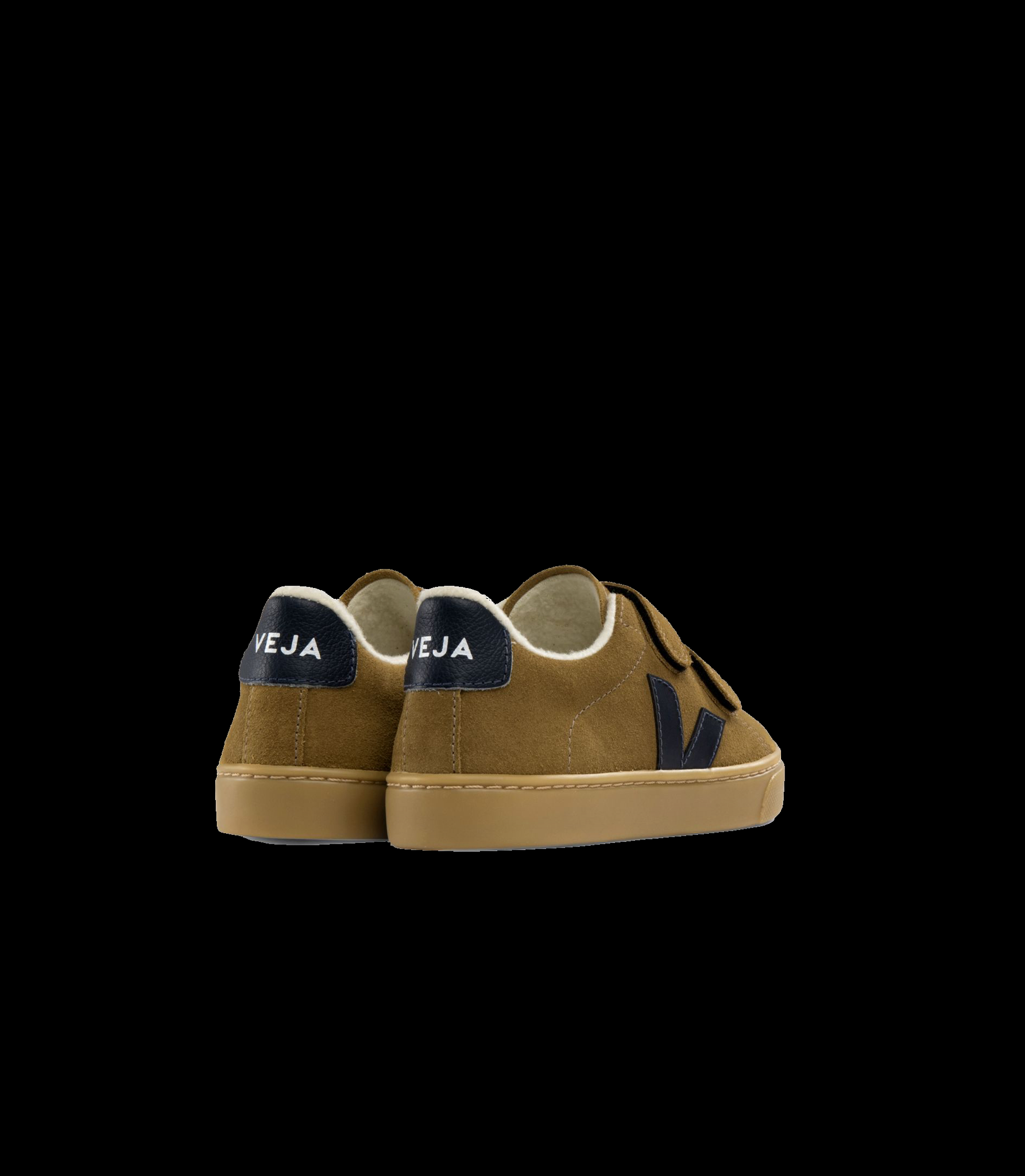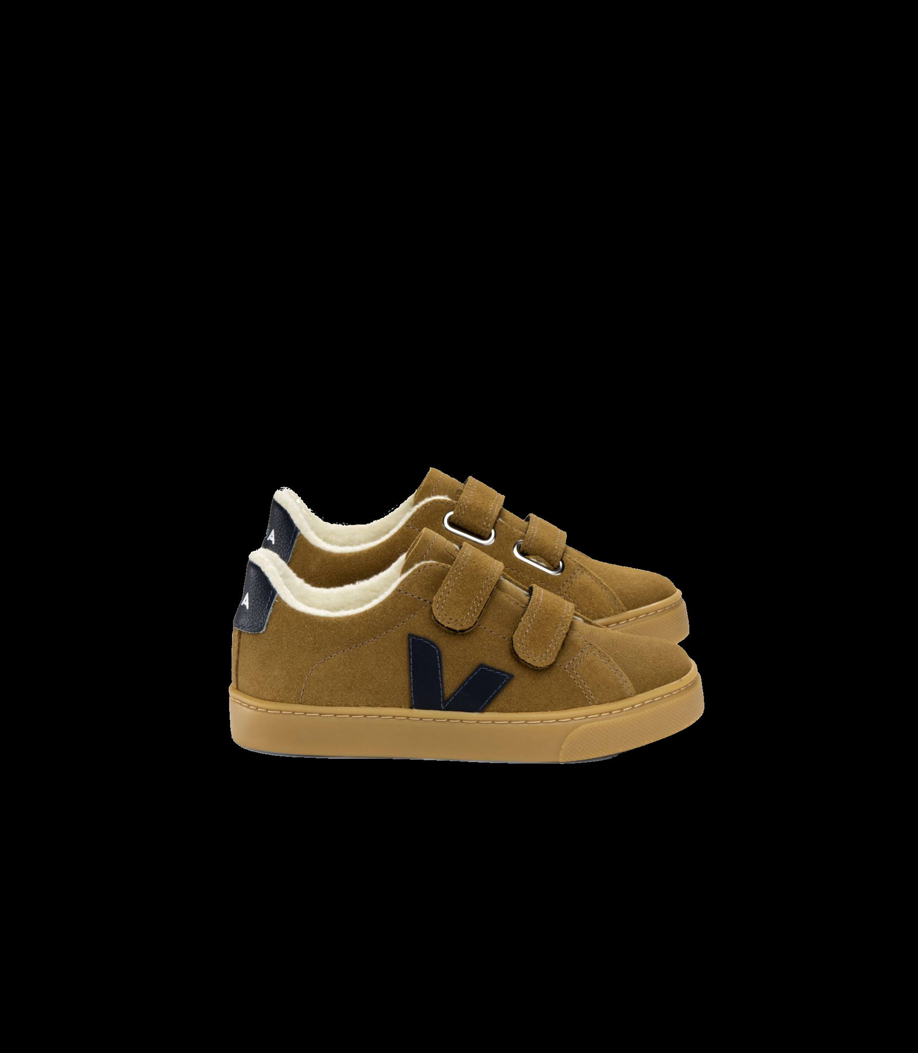 Veja Kids, marrone cammello, pelle scamosciata di vitello, dettaglio con pelliccia cruelty-free, applicazione laterale con logo, linguetta con logo stampato, punta tonda, chiusura frontale a strappo, rinforzo sul tallone a contrasto e suola piatta in gomma. Composizione: Fodera: pelliccia sintetica 100%, Suola: gomma 100%, Esterno: pelle scamosciata di vitello 100%